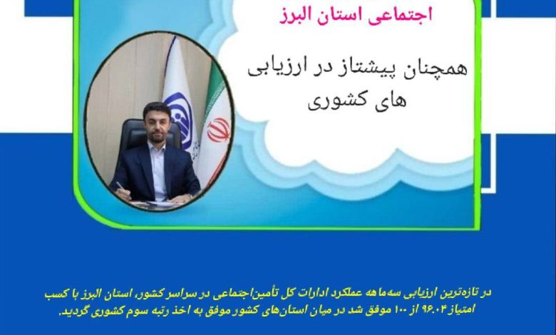 تازهترین ارزیابی سهماهه عملکرد ادارات کل تأمیناجتماعی در سراسر کشور، استان البرز با کسب امتیاز ۹۶.۰۴ از ۱۰۰ موفق شد در میان استانهای کشور موفق به اخذ رتبه سوم کشوری گردید.