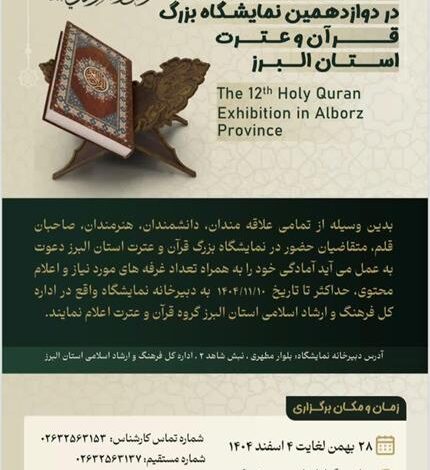 اداره کل فرهنگ و ارشاد البرز: فراخوان حضور در دوازدهمین نمایشگاه بزرگ قرآن و عترت