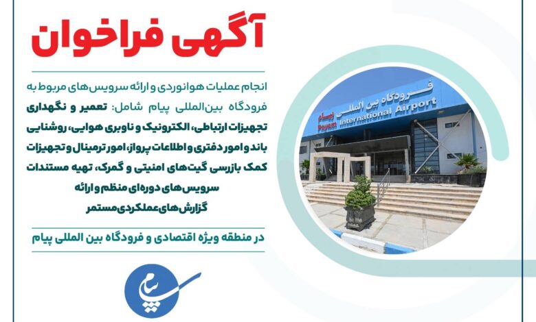 فراخوان فرودگاه بینالمللی پیام: انجام عملیات هوانوردی و ارائه سرویسهای مربوط